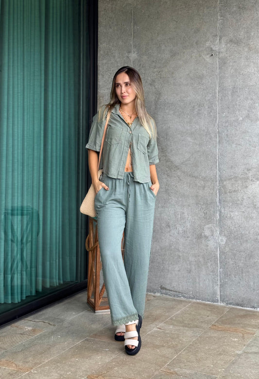 Set Lino Blusa Corta Beige