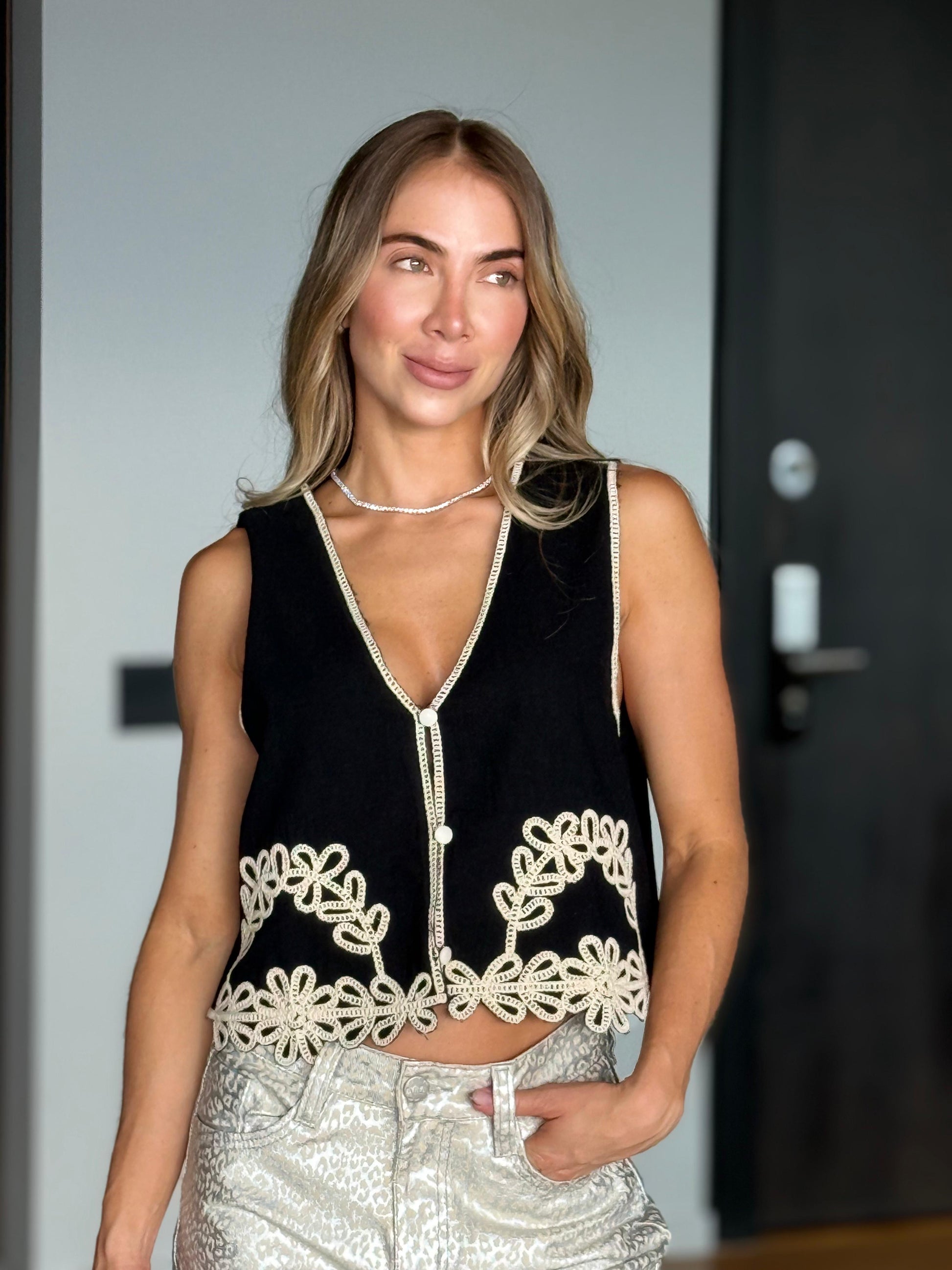 Este chaleco bordado con detalle de flores y botones negros es una pieza de moda fashion que agrega un toque de estilo a cualquier conjunto. Con su diseño bordado y su elegante color negro, este chaleco te hará destacar y lucir a la última moda. ¡Atrévete a lucirlo en cualquier ocasión!