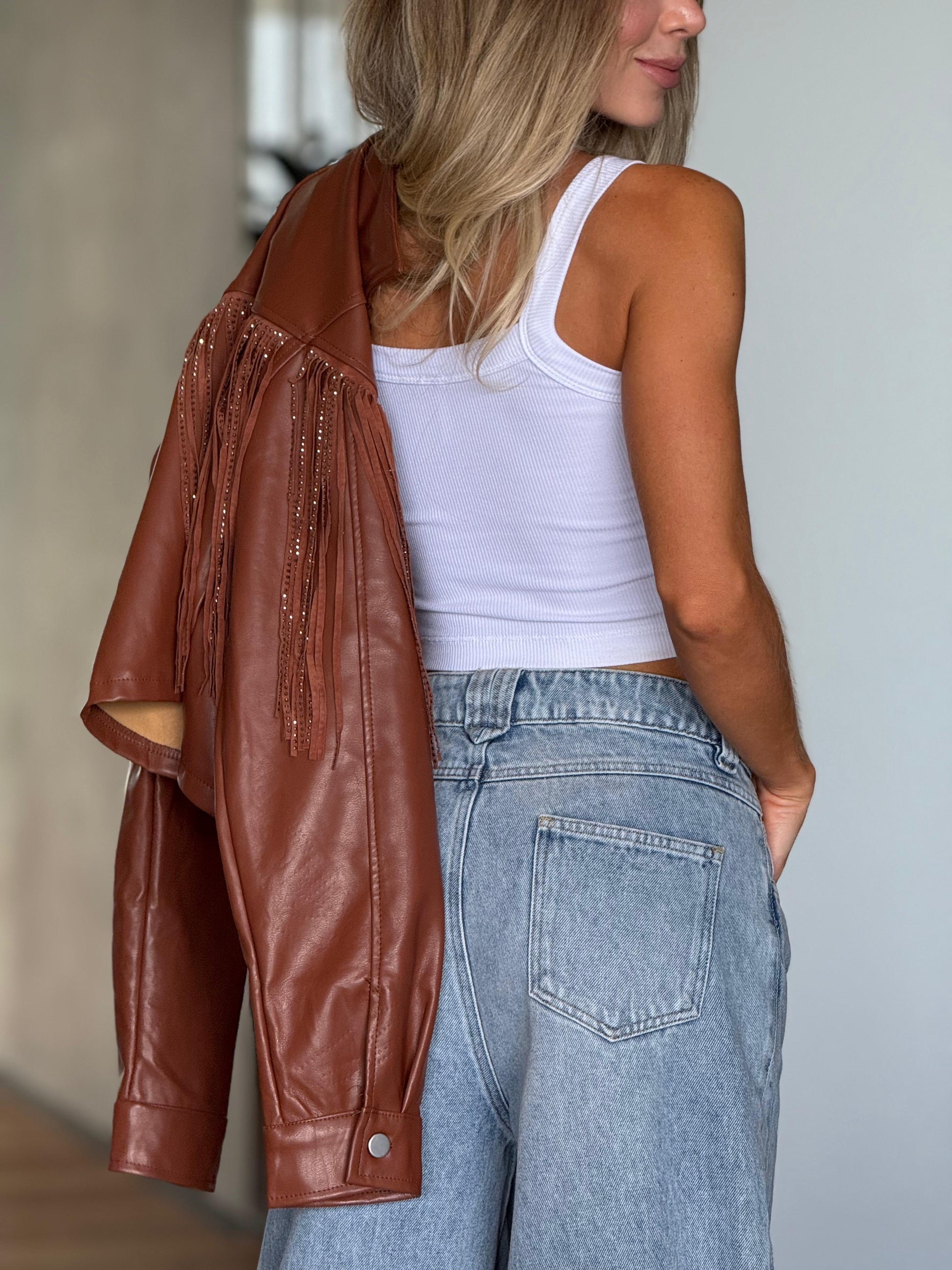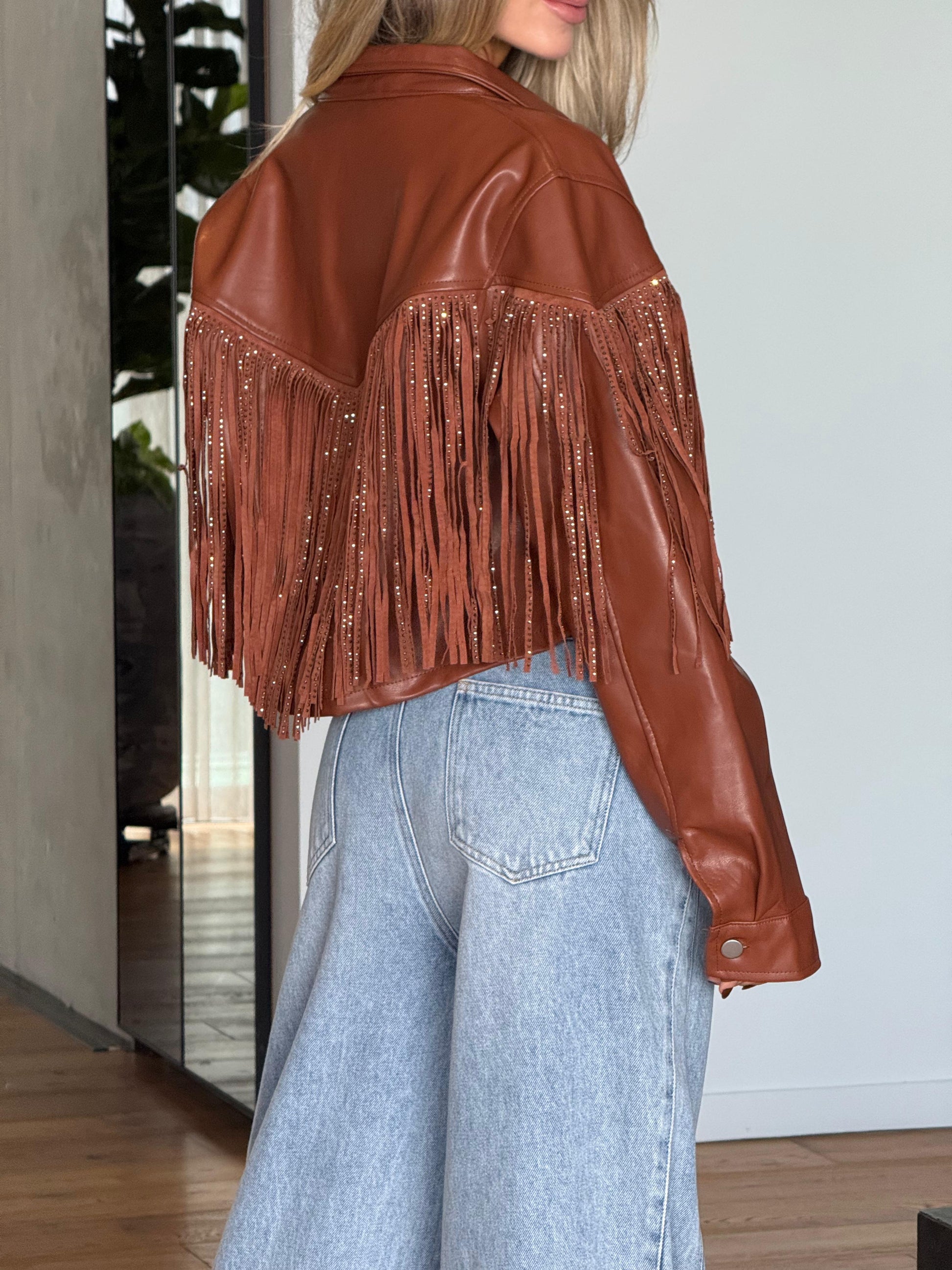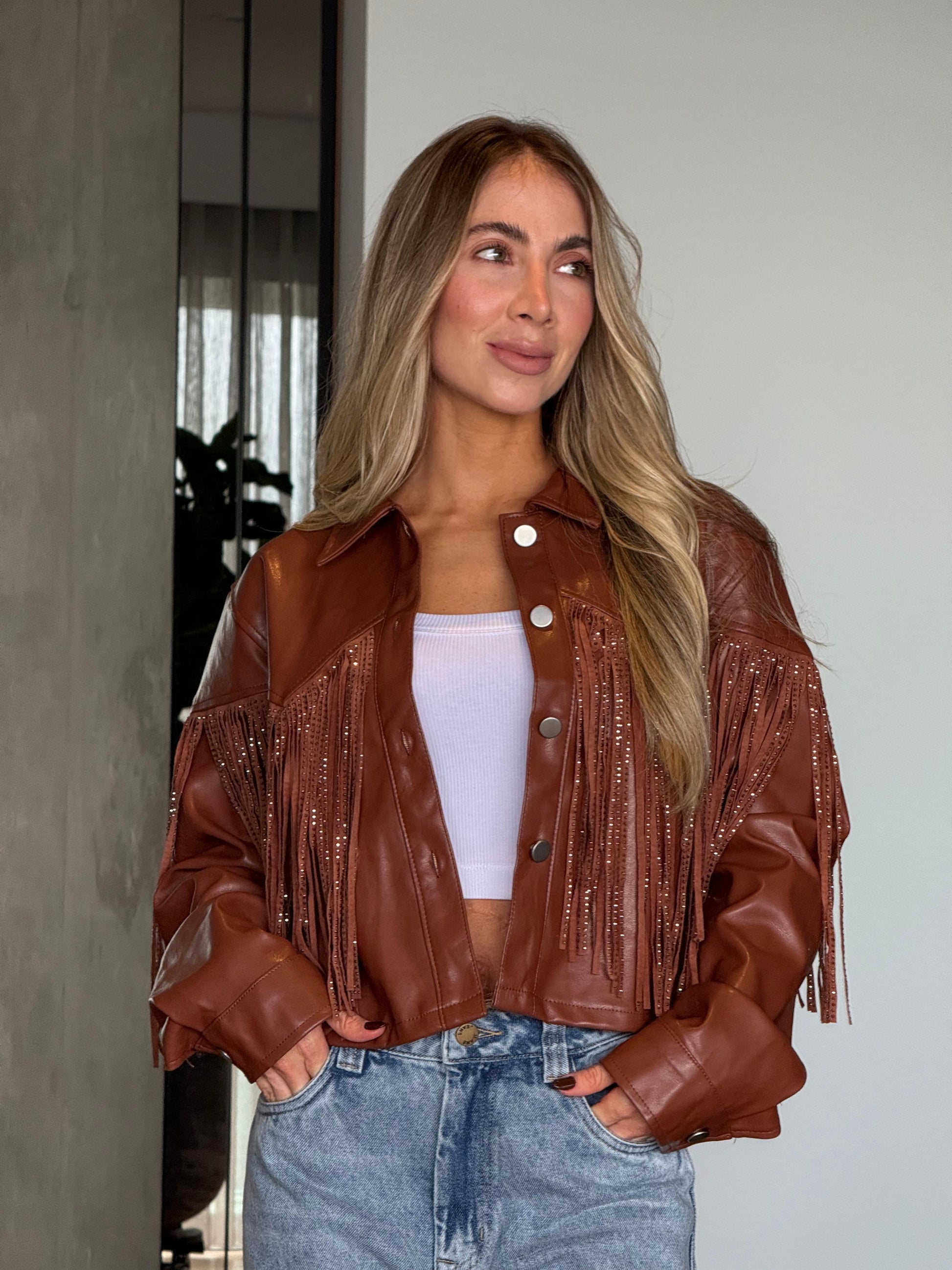 La Chaqueta Efecto Cuero Flecos Café es una prenda de tendencia confeccionada en un elegante material de cuero sintético. Sus flecos le dan un toque bohemio y moderno al mismo tiempo, ¡perfecta para cualquier ocasión! Además, su diseño encaja con cualquier estilo, asegurando versatilidad y estilo en tu guardarropa. ¡Haz una declaración de moda con esta chaqueta única en su tipo!